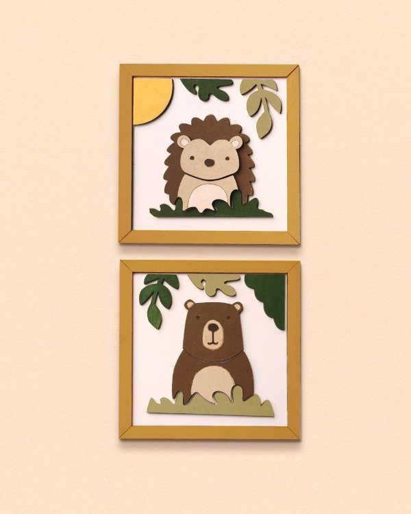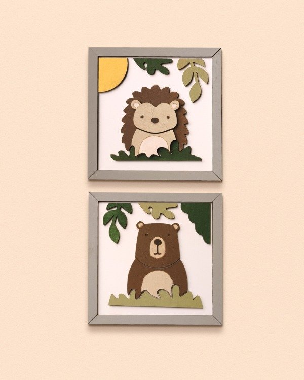 Viene con dos cuadritos con diseño de animalitos, para pintar por partes y pegar sobre su base. El resultado tiene relieve, color y queda buenísimo para colgar o regalar.