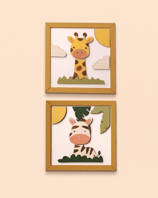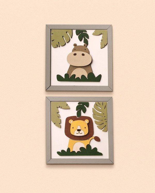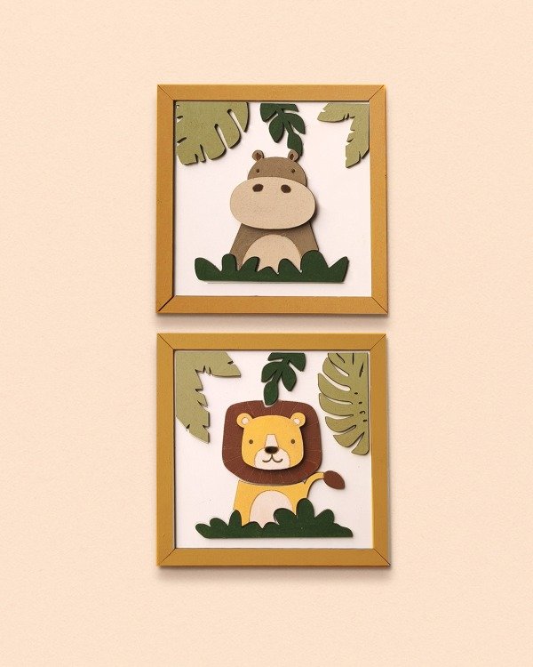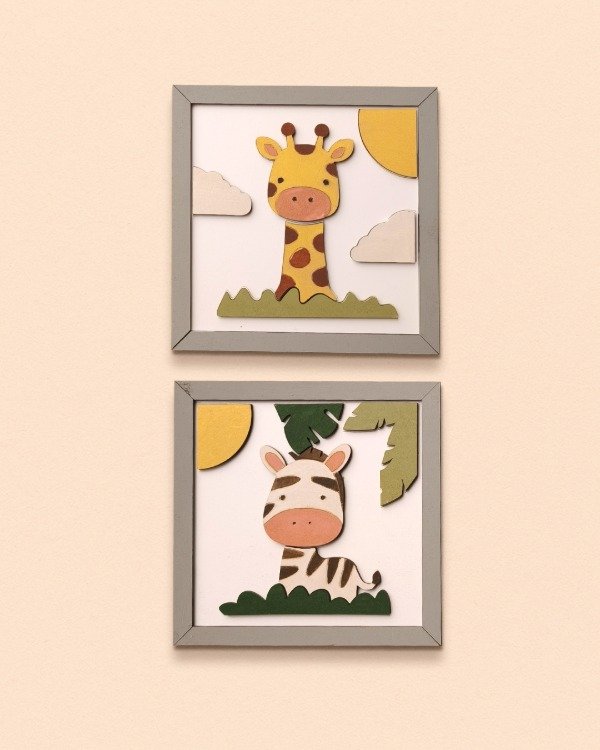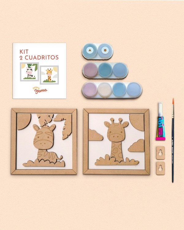 Viene con dos cuadritos con diseño de animalitos, para pintar por partes y pegar sobre su base. El resultado tiene relieve, color y queda buenísimo para colgar o regalar.